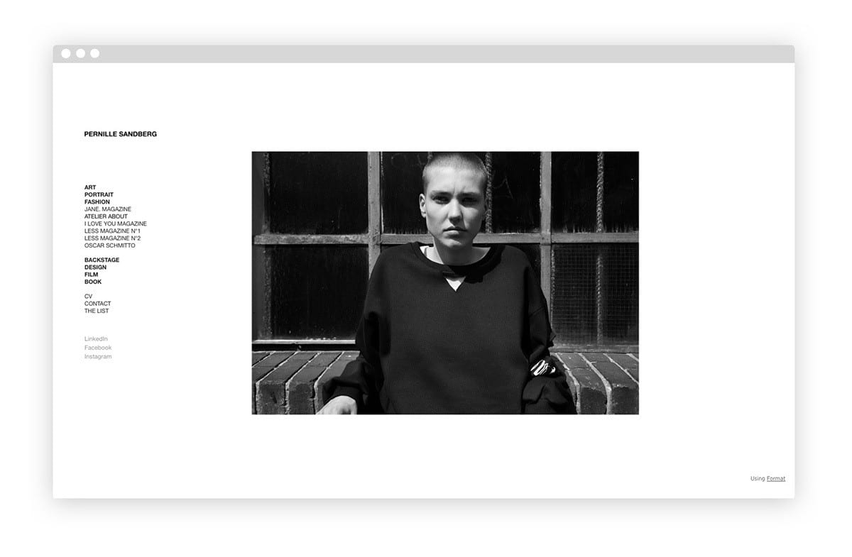 Based between Berlin and Scandinavia, photographer Pernille Sandberg shoots fashion and fine art photos, mostly in black and white. Whether she’s creating abstract portraits or documenting backstage moments at runway shows, Pernille’s images are powerful. She uses a minimal sidebar theme to sort her work into categories like art, portrait, and fashion series.